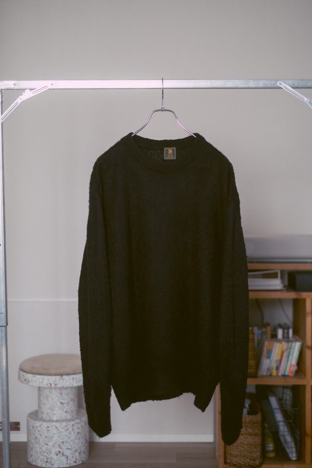 Noenのモヘアライクのクルーネックニット。 ナイロン素材をベースに、本来のモヘアのチクチク感がなくふわっとした柔らかな素材感。 程よい生地の厚さで暖かく、着心地は軽く楽に着れる寒い時期にはありがたい1着。 秋から春の初めあたりまで長く着れて、カラーもブラックなので使いやすく重宝すると思います。 サイズ感は172センチの僕でオーバーサイズ気味に着れます。 〈サイズ寸法〉 肩幅 59 身幅 65 着丈 74 袖丈 68 ※寸法数字は全て㎝表記です。 また、寸法は私達が実寸しており若干の誤差がでる場合がございます。