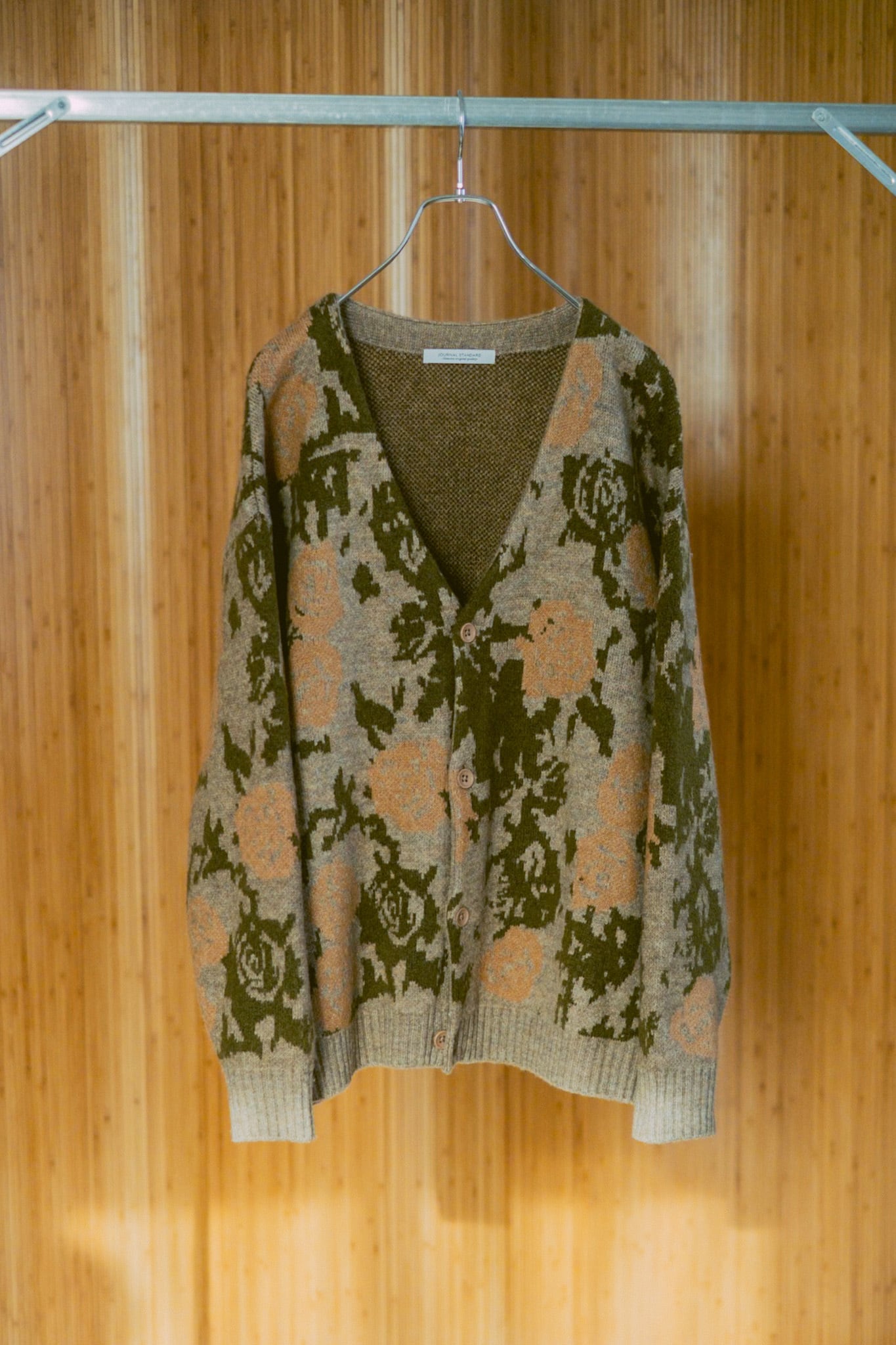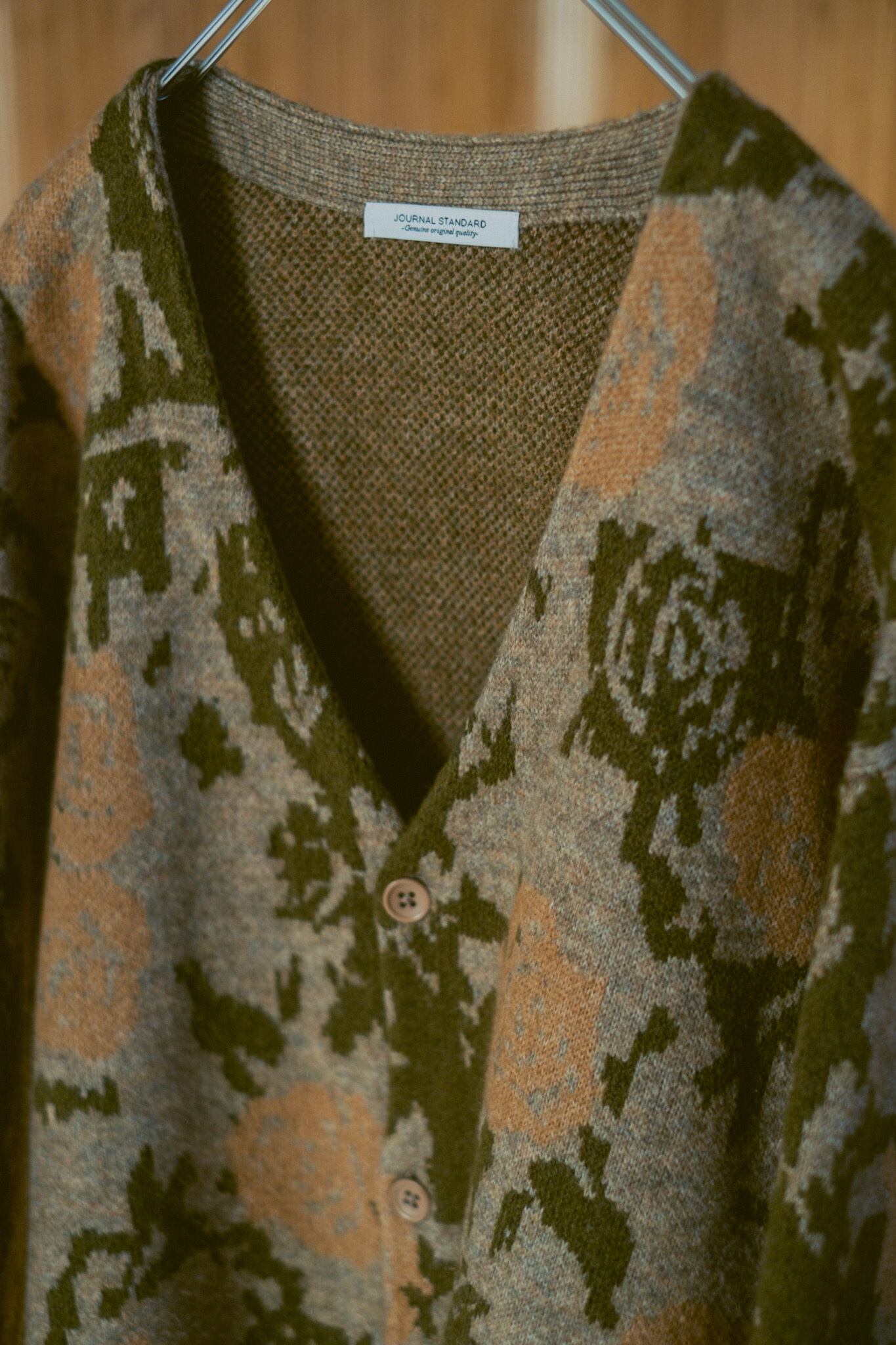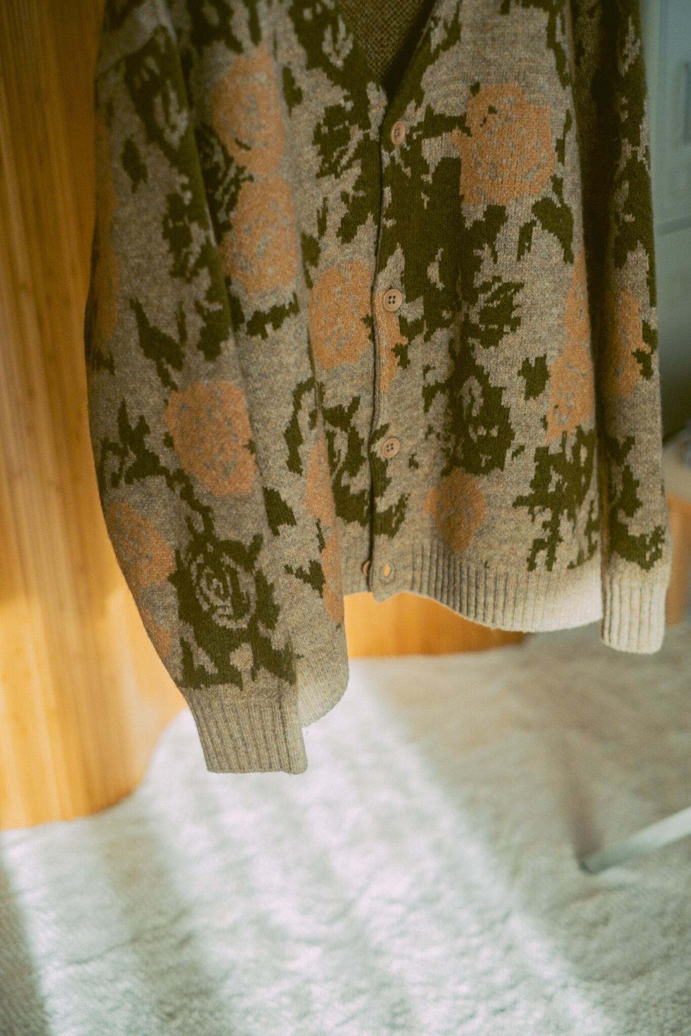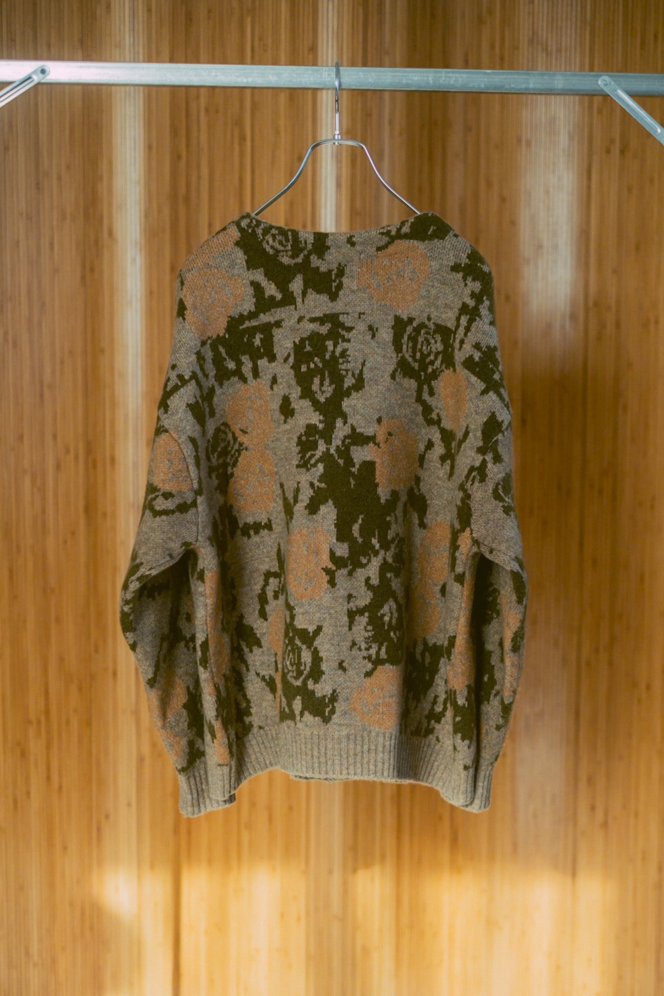 カモ柄のニットカーディガン。