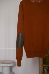 このニットの特徴的なデザインとなるエルボーパッチは、マルジェラのなかでも定番で人気の高いデザインでパッチ部分にはリアルレザー(牛革)を使用しています。